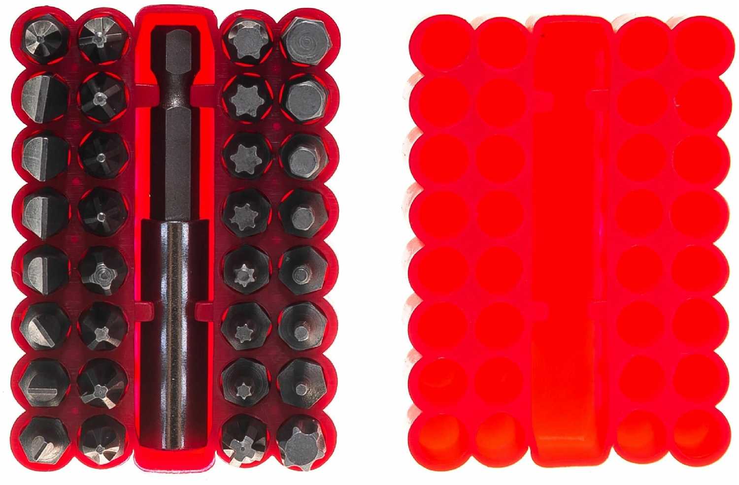 | Дополнительная информация : | магнитный адаптер, 33 предмета, хромованадиевая сталь, прецизионная геометрия шлицов, система насечек "фикс", суперкомпактный бокс, защита от выскальзывания крепежа, высокая механическая прочность, надежное хранение |