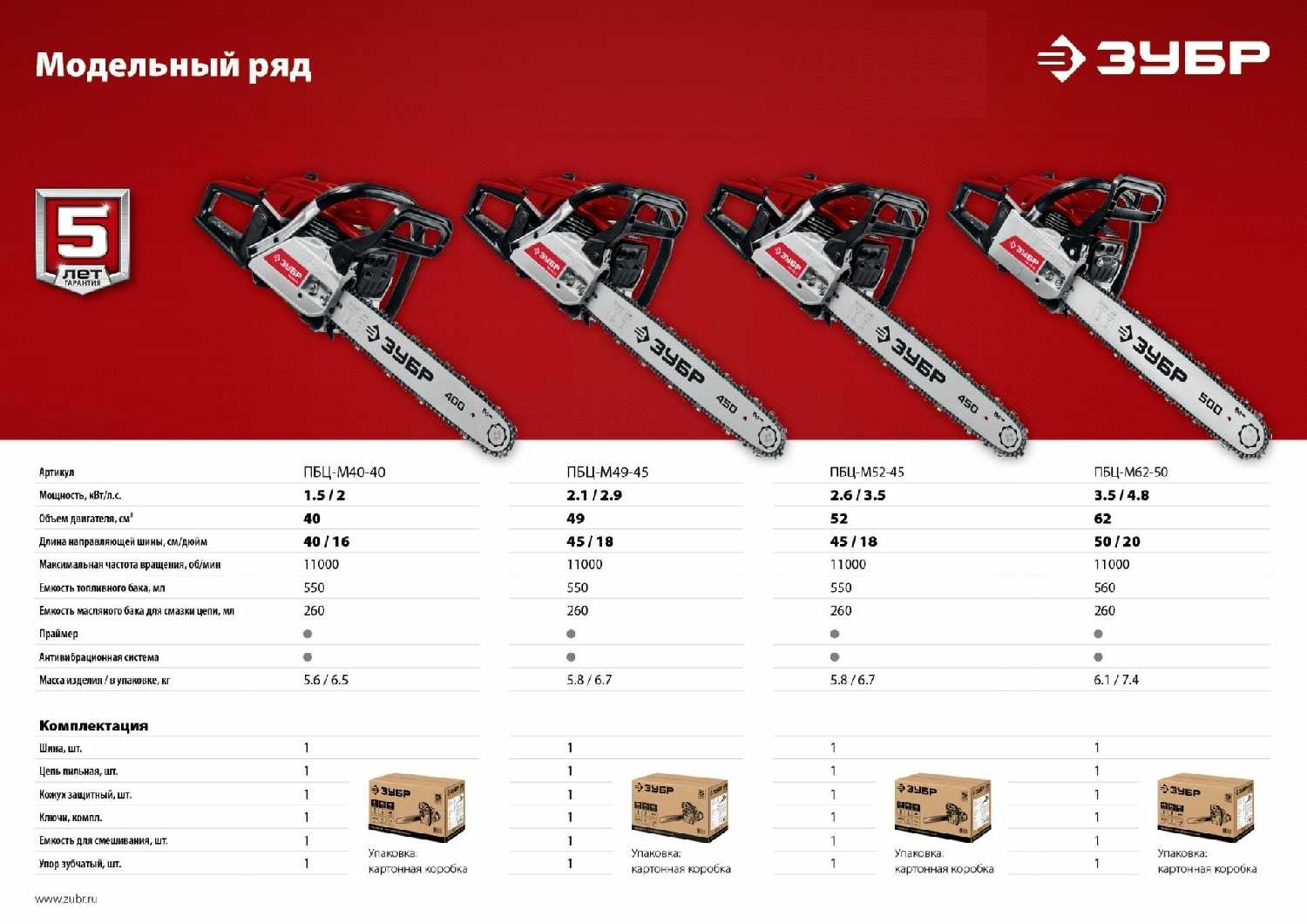 Комплект поставки : | пила Зубр ПБЦ-М49-45, шина, цепь пильная, кожух шины, ключ универсальный, ключ имбусовый (2 шт.), зубчатый упор, емкость для смешивания, дополнительная катушка стартера, руководство по эксплуатации |