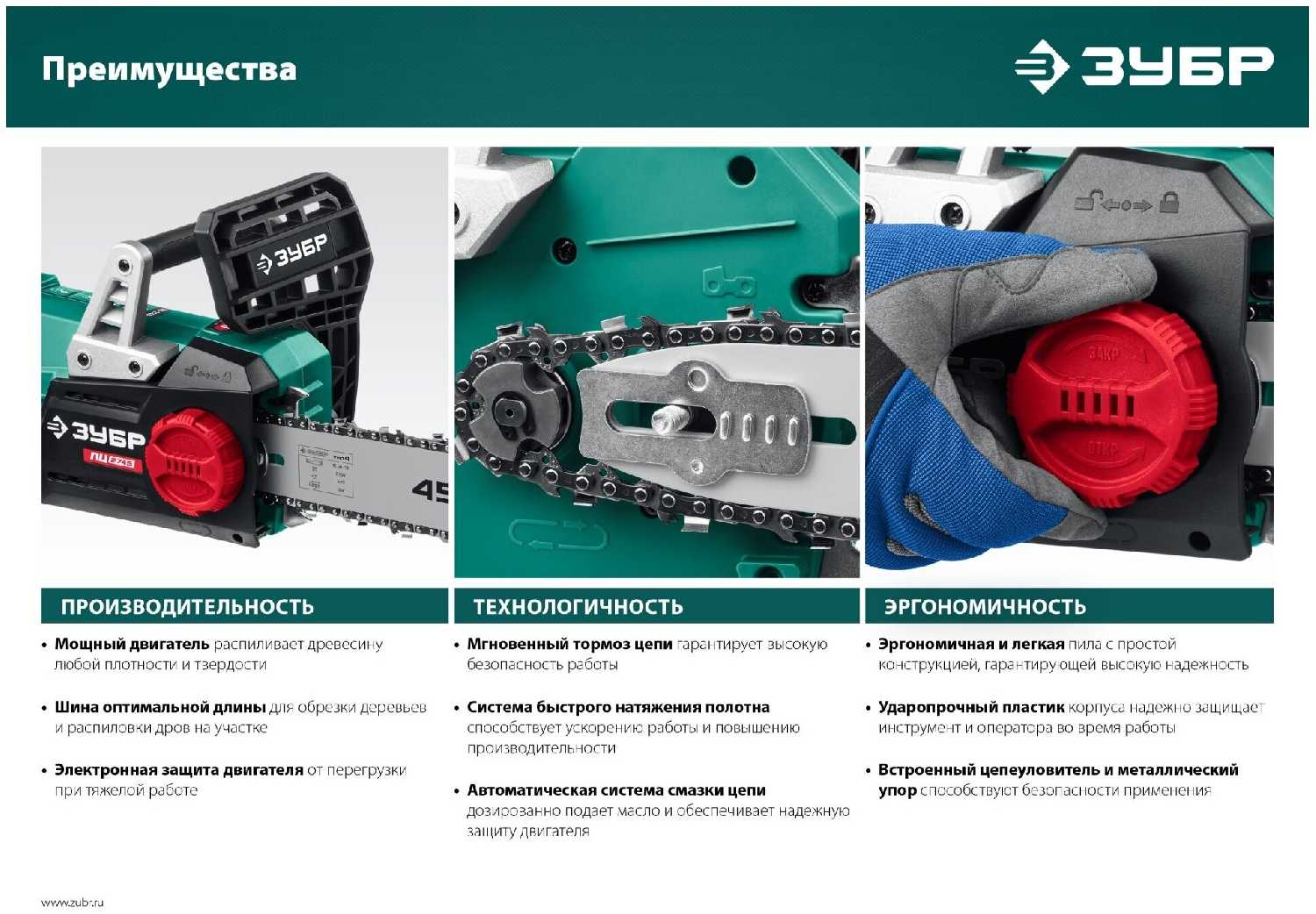 Пила оснащена тормозом цепи, который, по отзывам, срабатывает моментально. Это важная функция безопасности, которая обеспечивает защиту оператора в случае обратного удара или другой нештатной ситуации. -