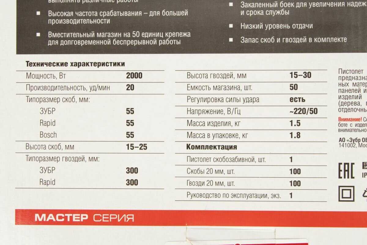 Дополнительная информация : | комплектация: пистолет скобозабивной, скобы 20 мм. - 100 шт., гвозди 20 мм. - 100 шт., инструкция по безопасности, руководство по эксплуатации |