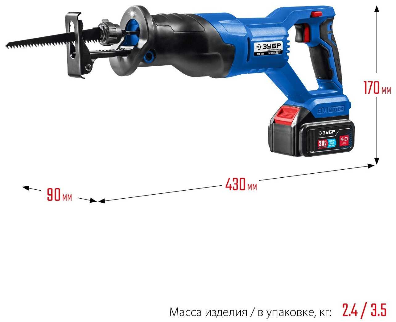 Комплект поставки : | пила сабельная, аккумулятор, зарядное устройство, руководство по эксплуатации |