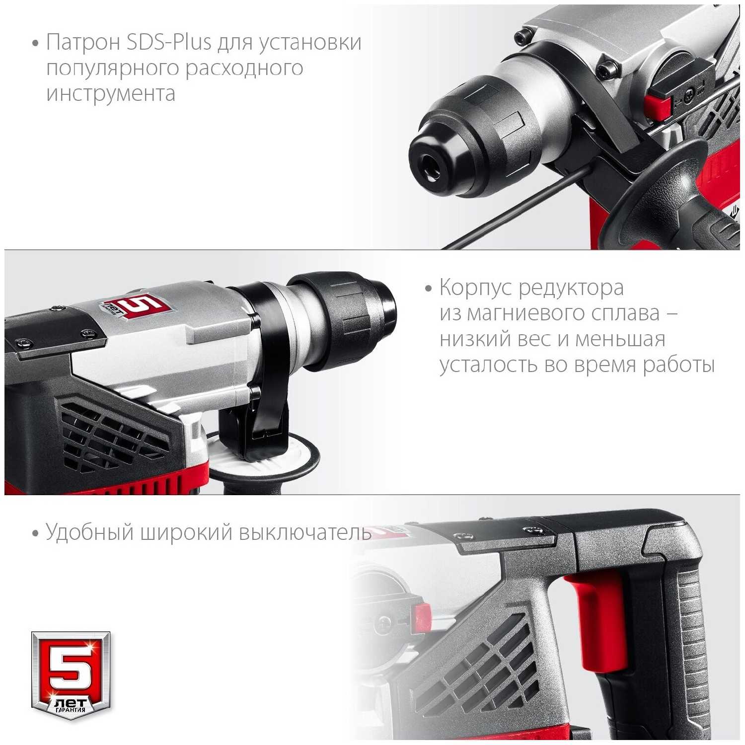 Особенности конструкции : | антивибрационная система, дополнительная рукоятка, ограничитель глубины сверления, предохранительная муфта, фиксация шпинделя |